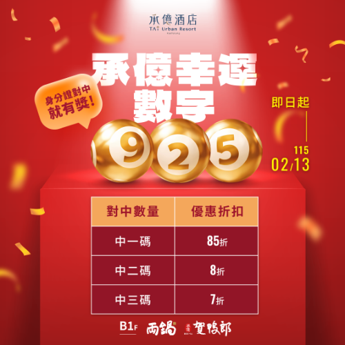 身分證字號含數字「9、2、5」,到承億用餐就能輕鬆享優惠!