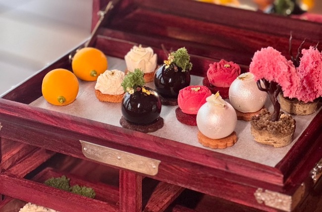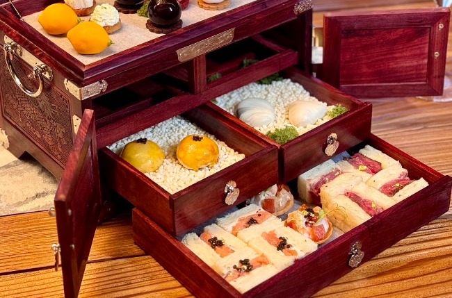將多樣風味的精緻甜點和茶點珍藏於一個精雕細琢的木盒中。